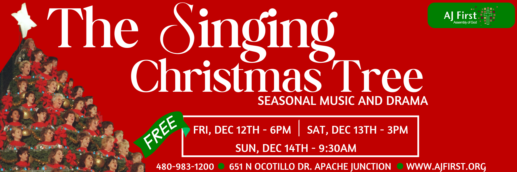 Friday, December 12th at 6PM, Saturday, December 13th at 3PM, Sunday, December 14th at 9:30AM. Please join us for a FREE family friendly event with seasonal music and a drama! Mark your calendars and invite your friends and family!